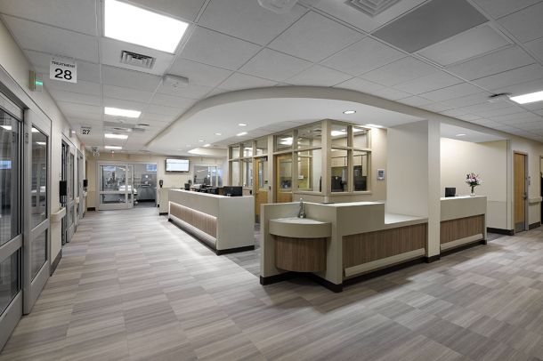 Centralized Nursing Station Soffit Lowered Ceiling Above Patient Rooms For A Feeling Of Privacy Emergency Department Hospital Architecture Hospital Interior